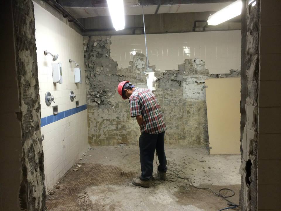 A demolition worker removes the tile floors with a chipping hammer at the Men’s Shower Room as part of the renovations. The renovations of the locker rooms are expected to end in early December. Men and women will be splitting the rooms throughout the renovations.
